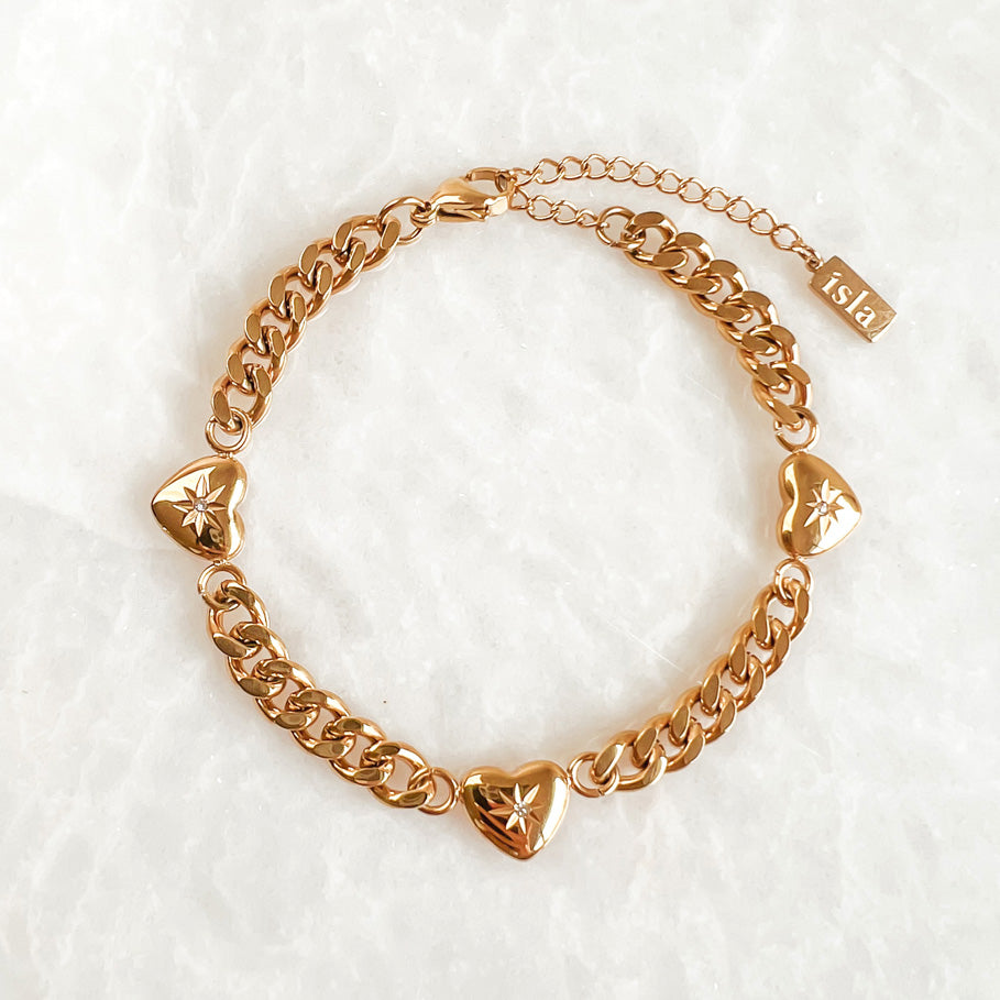 Crystal hearts Bracelet is effortlessly beautiful. Featuring a chain of golden links connected by three sparkly zirconia hearts. This bracelet wears comfortably on the wrist and will add a glamorous look to your outfit.